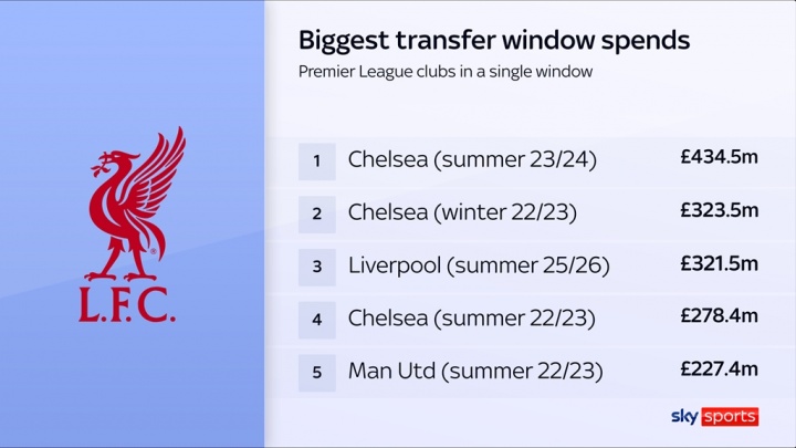 2利物浦还花了2.95亿英镑在历史上排名第三 而切尔西则以4.34亿英镑排名第一