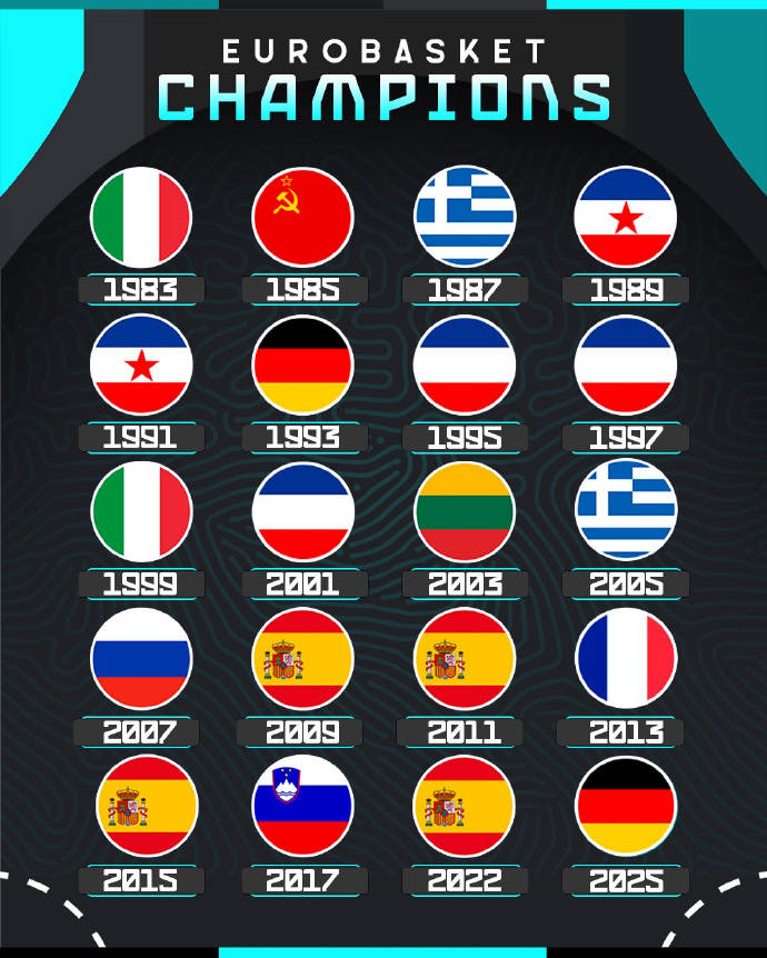 北京时间2025年9月16日,男篮欧洲杯正式落下帷幕,德国击败土耳其夺冠。这也是德国时隔32年后再夺欧洲冠军。历届欧洲冠军如下:1983年: